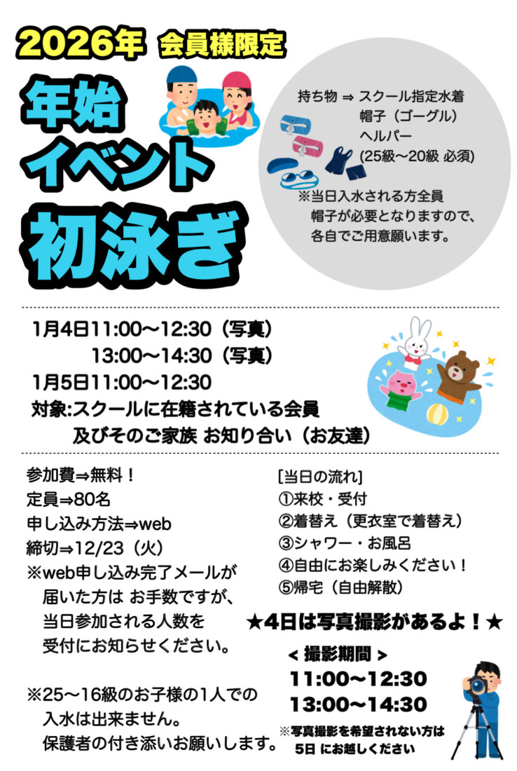 - 泳げなかった子も楽しく基礎をしっかり覚えることにより泳ぐ事が苦でなくなります。基礎がしっかり出来ていれば応用(泳法)も出来るようになると考えます。