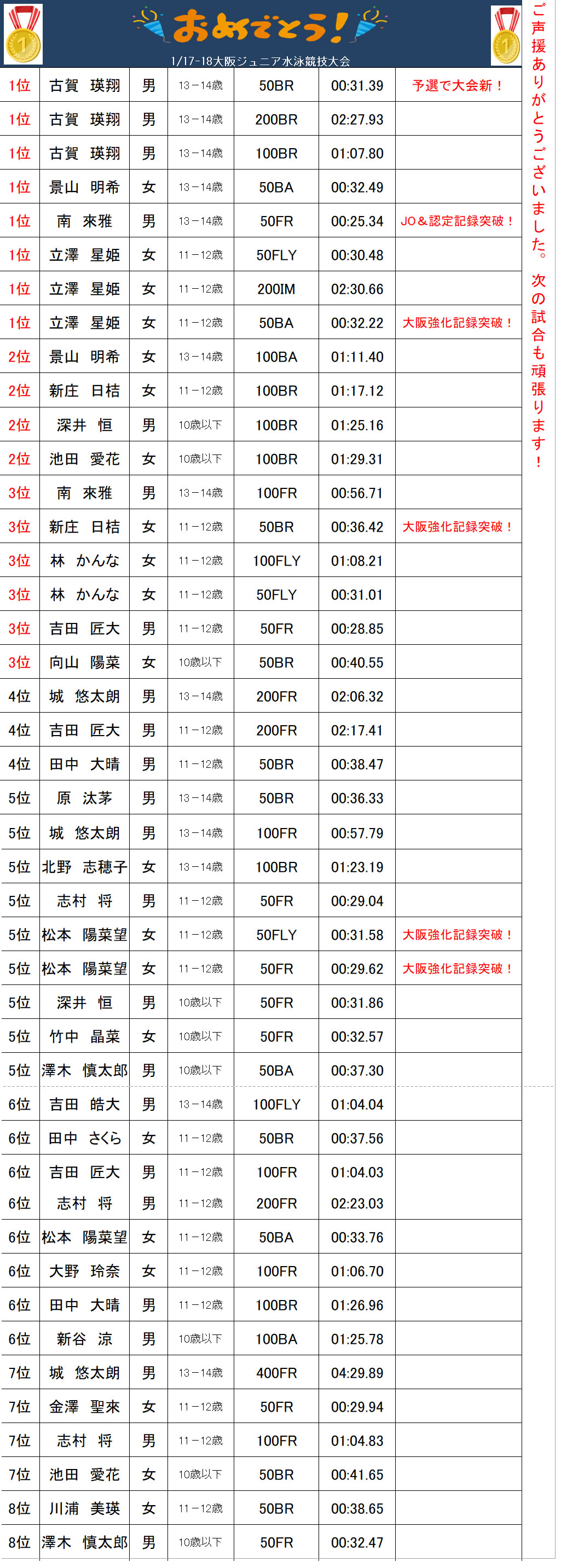 1/17-18大阪ジュニア水泳競技大会