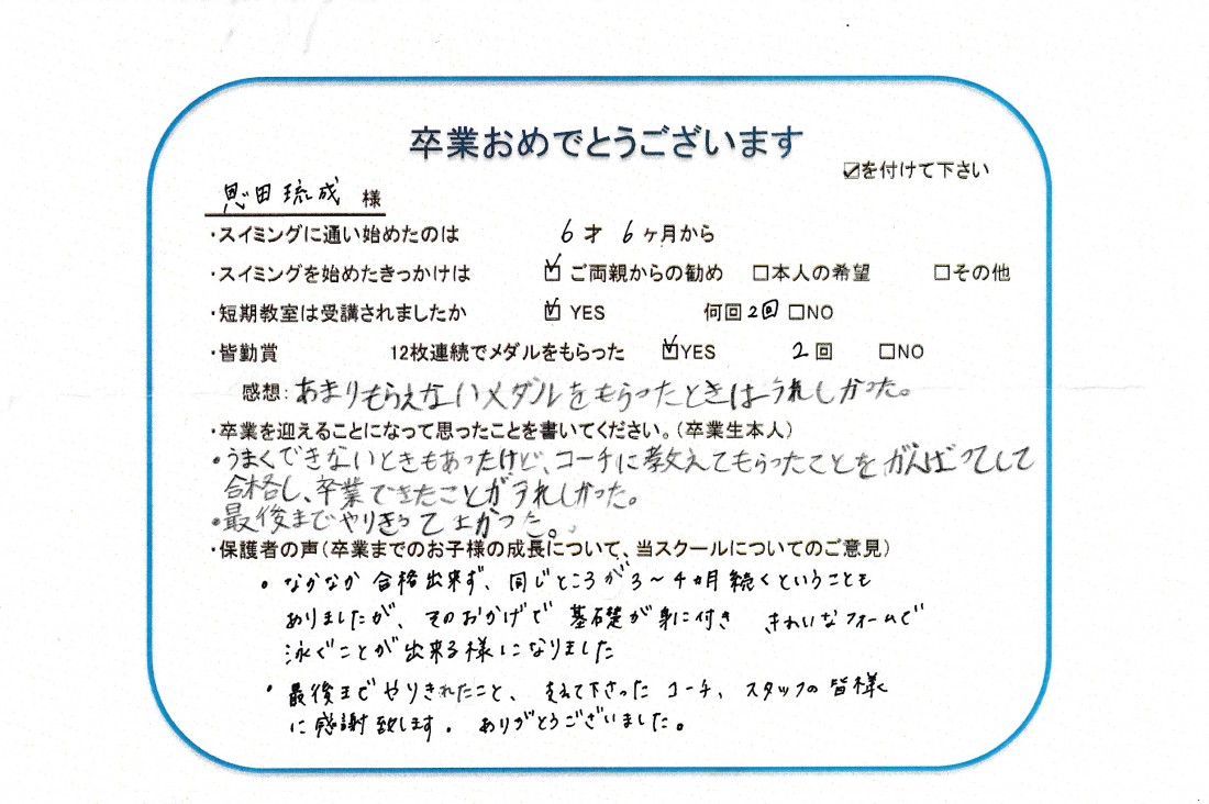 HOME > 在校生及び卒業生の声 > 2022年1月卒業生(琉成くん)