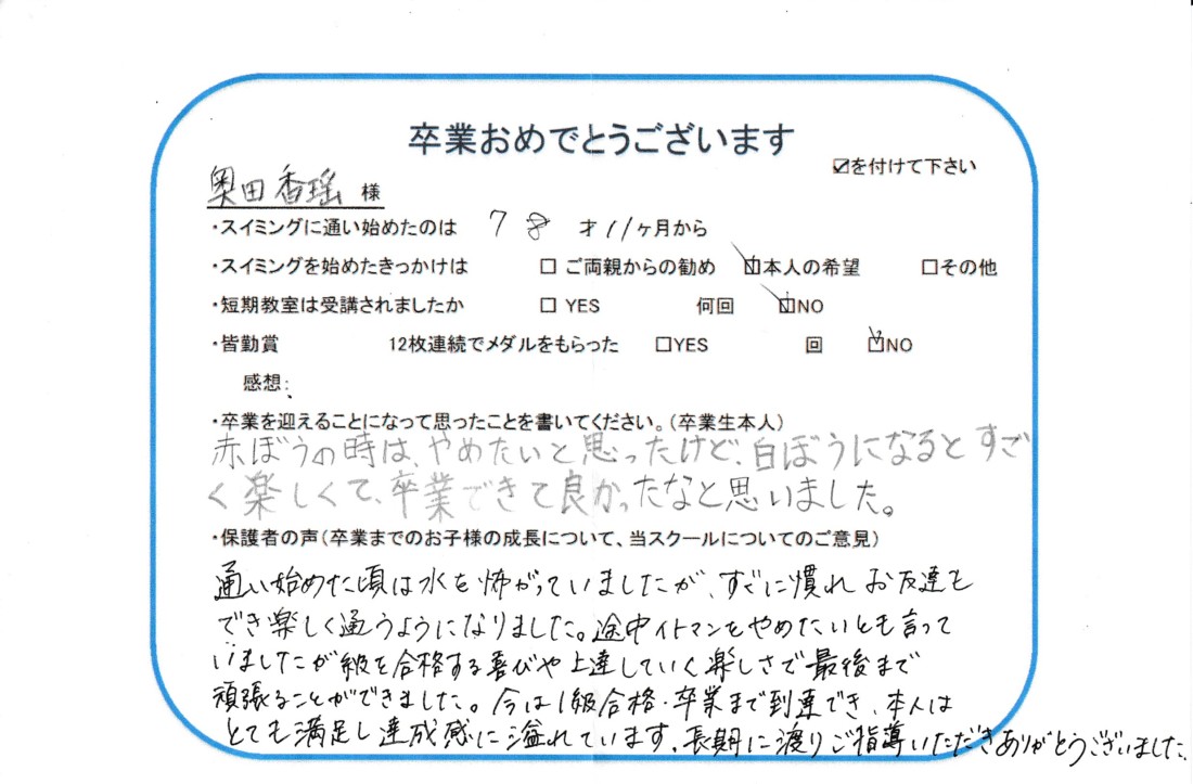 HOME > 在校生及び卒業生の声 > 2023年12月卒業生(香瑶ちゃん)