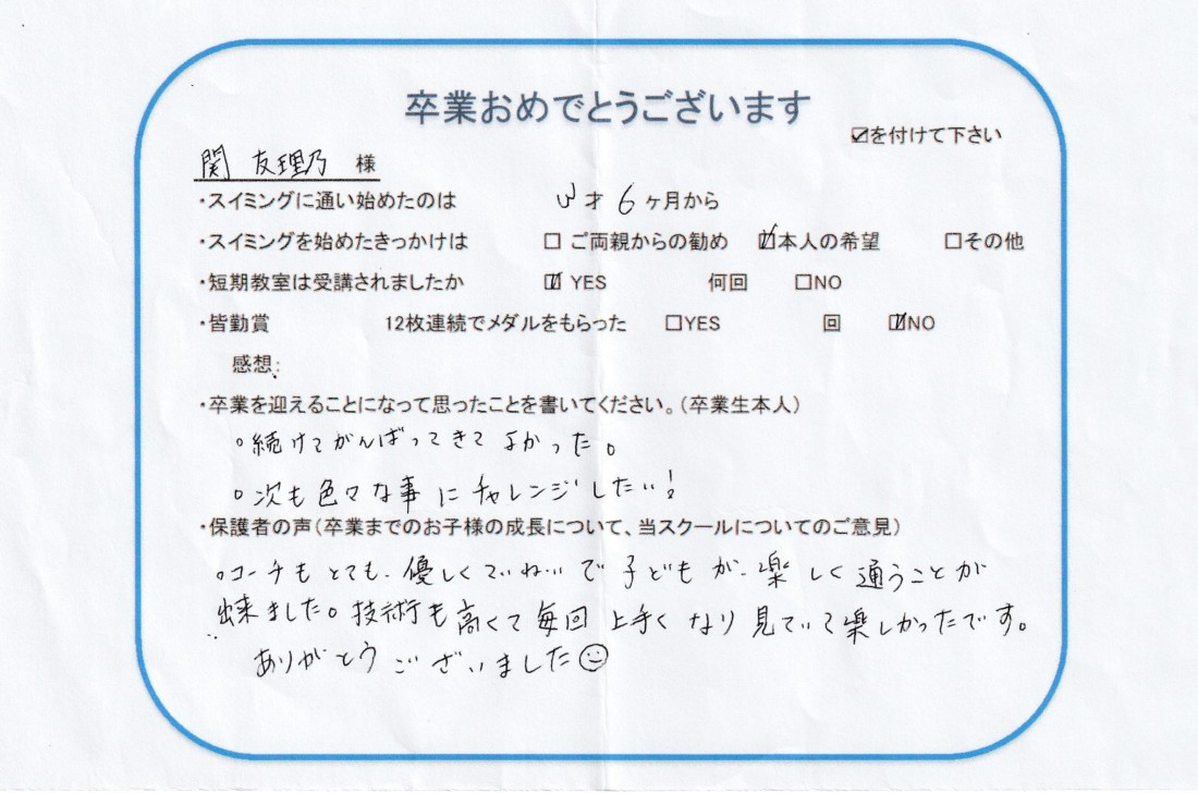 HOME > 在校生及び卒業生の声 > 2024年1月卒業生(友理乃ちゃん)