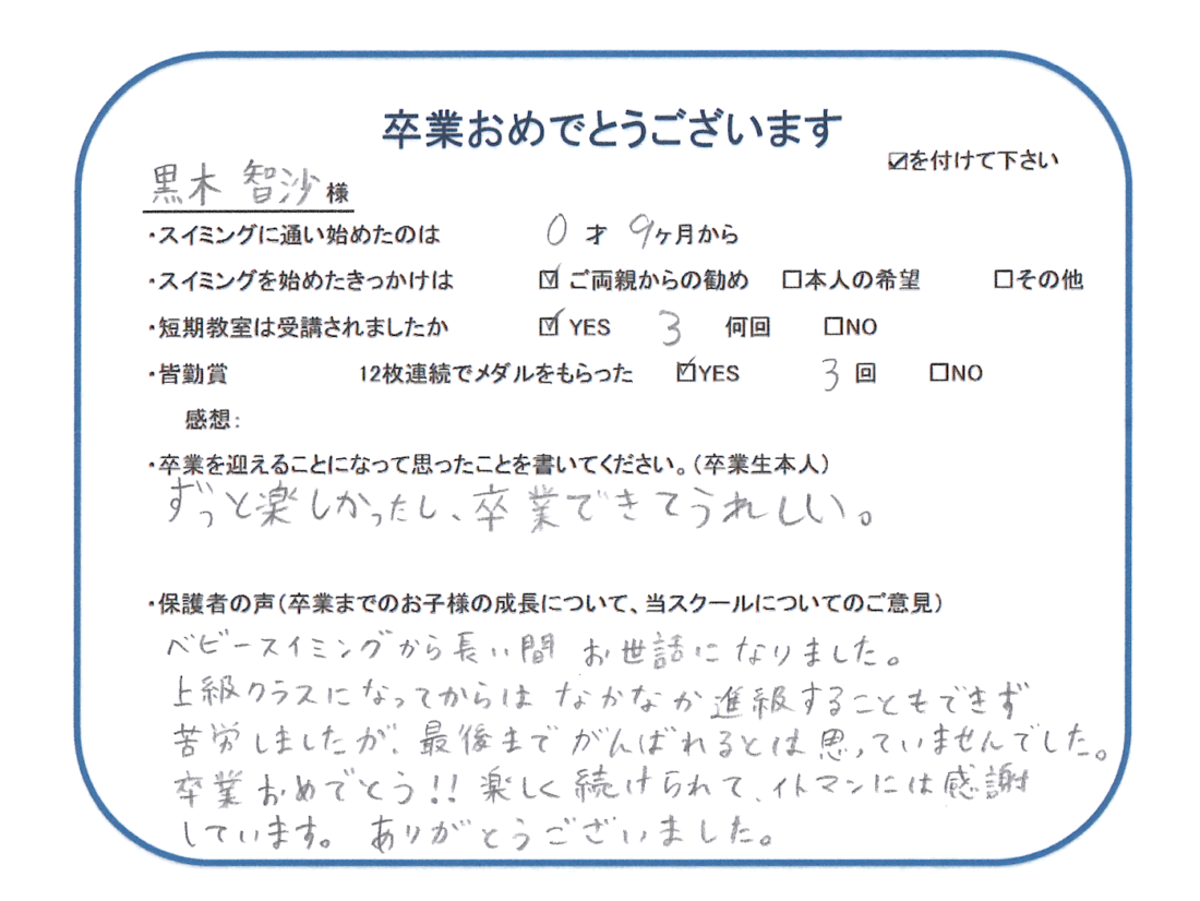 HOME > 在校生及び卒業生の声 > 2025年9月卒業生(智沙ちゃん)