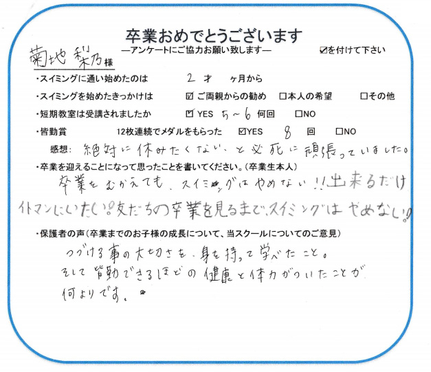 HOME > 在校生及び卒業生の声 > ジュニアクラス卒業生(梨乃ちゃん)